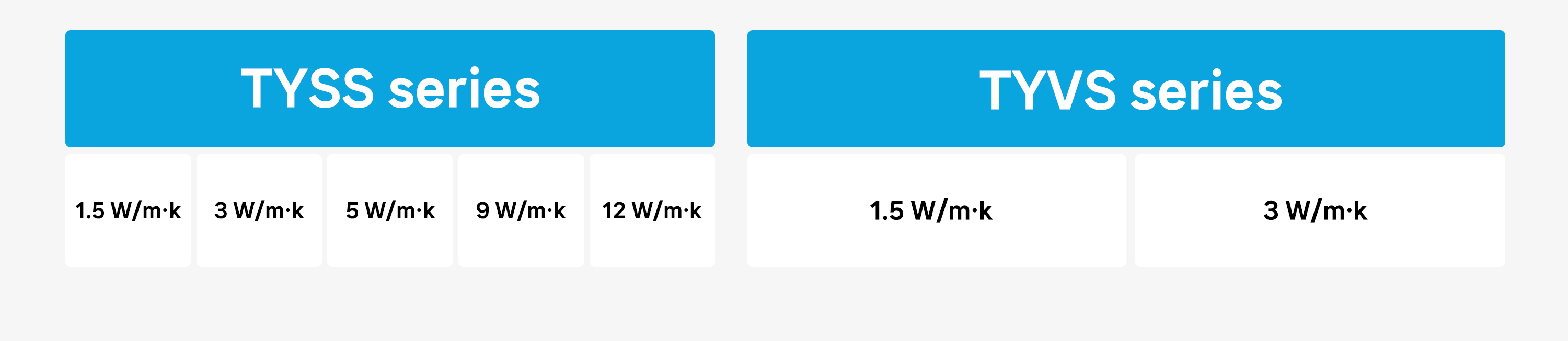 - TYVS Series (Low-Molecular Siloxane Specialized): 1.5, 3 W/m·K